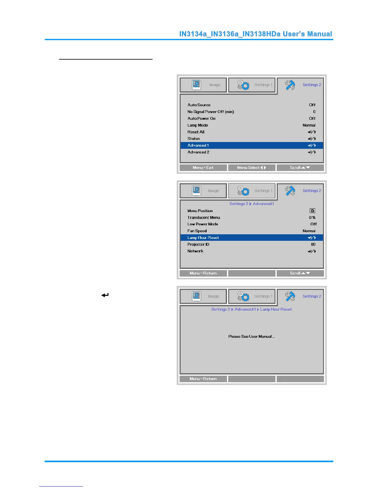 After replacing the lamp, you should reset the lamp hour timer to zero. Refer to the following: