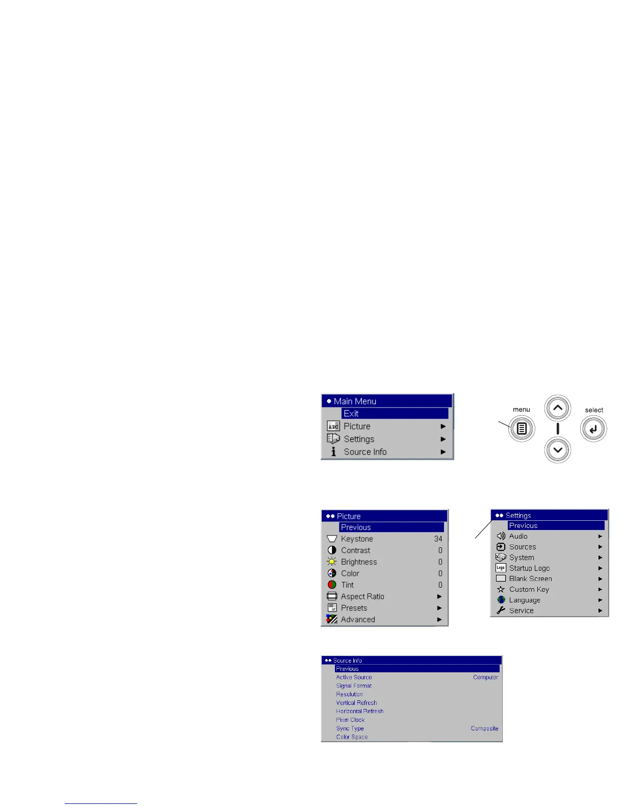 Main menu appears. Use the arrow buttons to move up and down to high-
