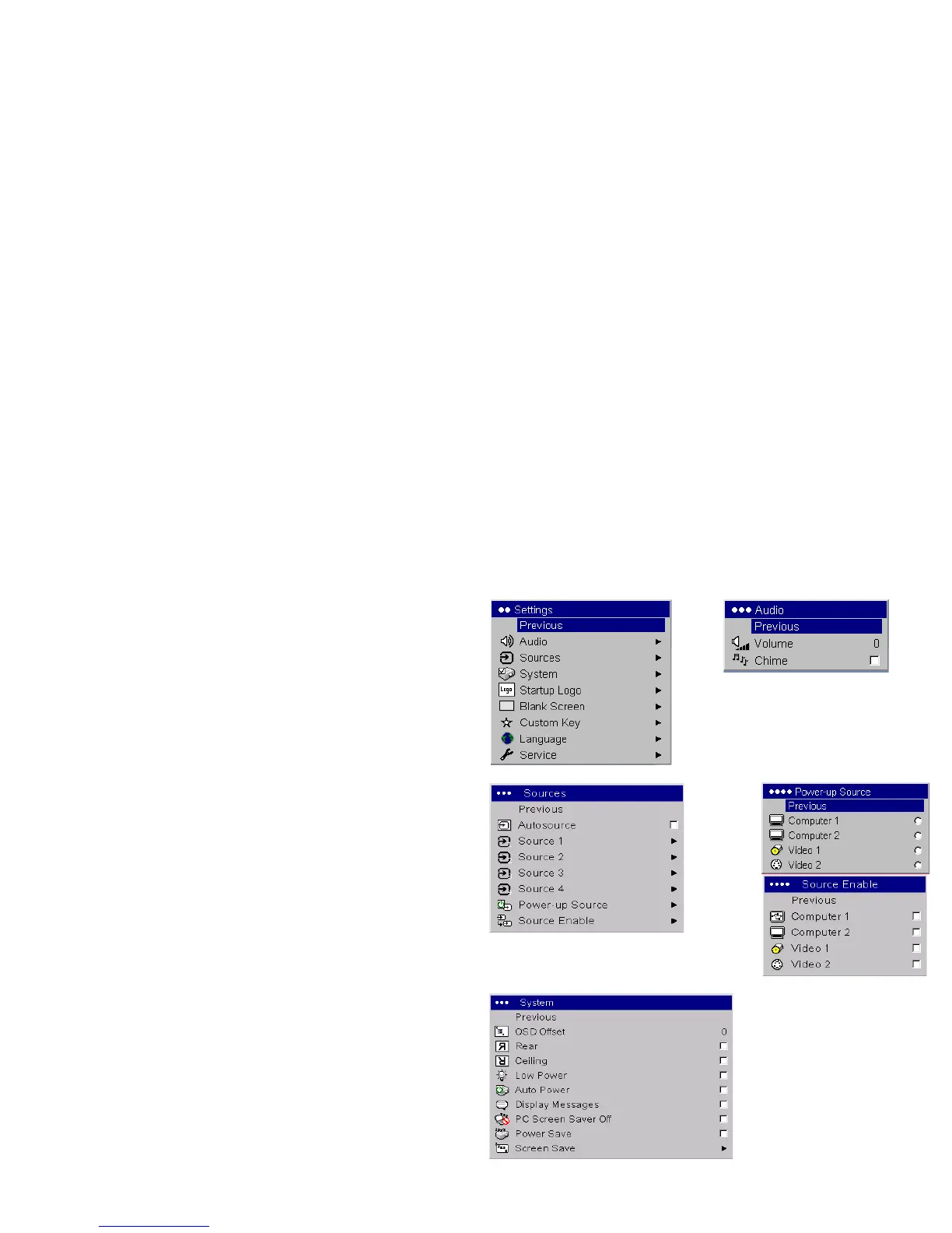 Audio: allows adjustments to the volume and balance, and turns the projec-