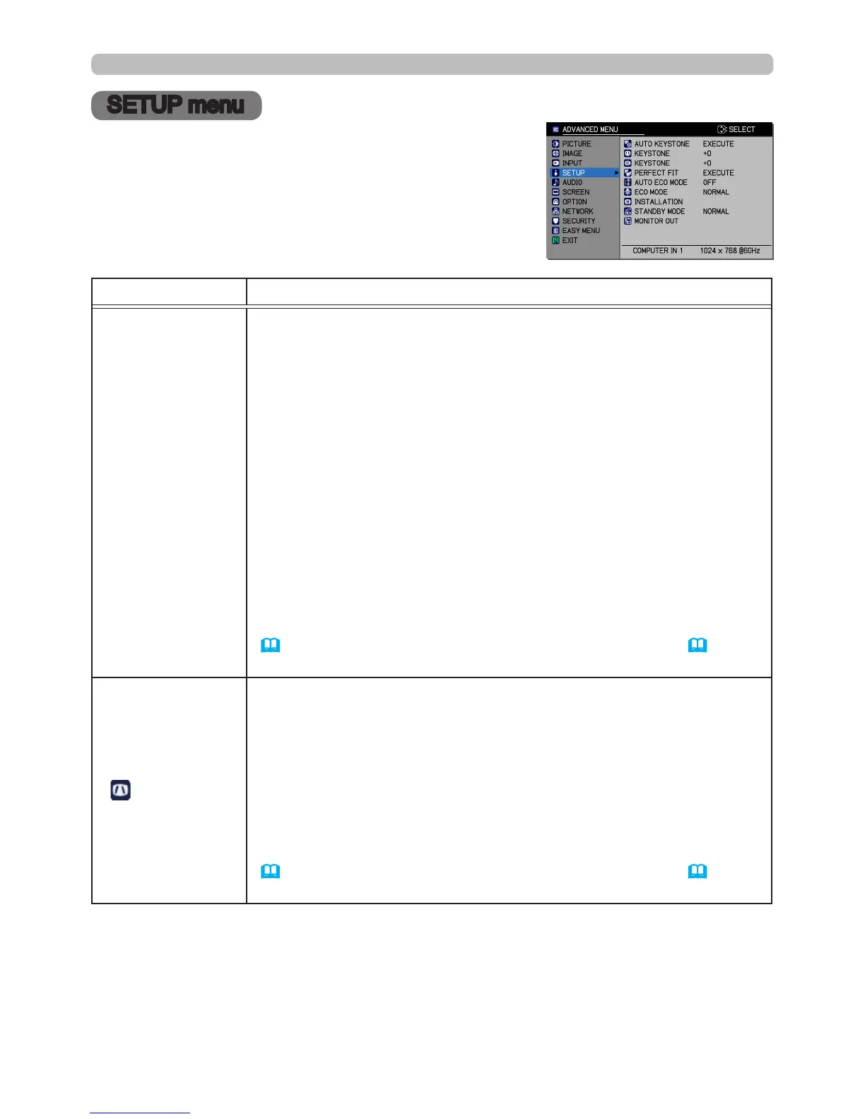 INSTALLATION item in the SETUP menu, and the projector screen