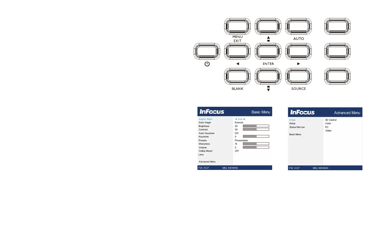 1 To open the menus, press the Menu button on the keypad or remote. (The