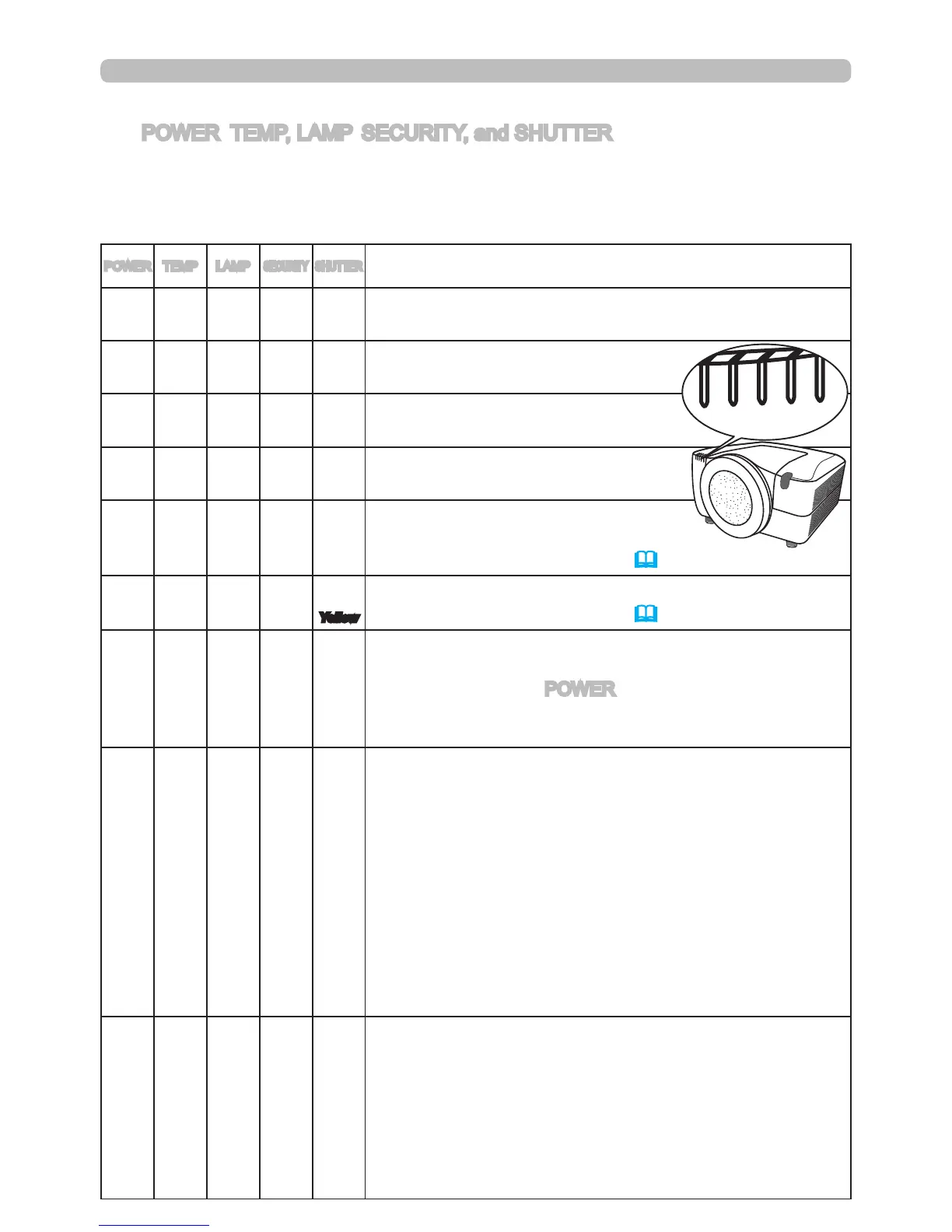 The POWER, TEMP, LAMP, SECURITY, and SHUTTER indicators have meanings