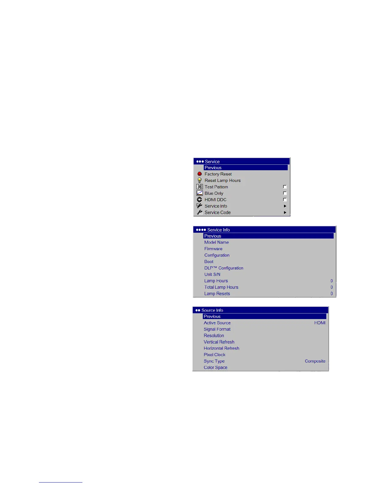 Service Info: provides information about the projector’s software,