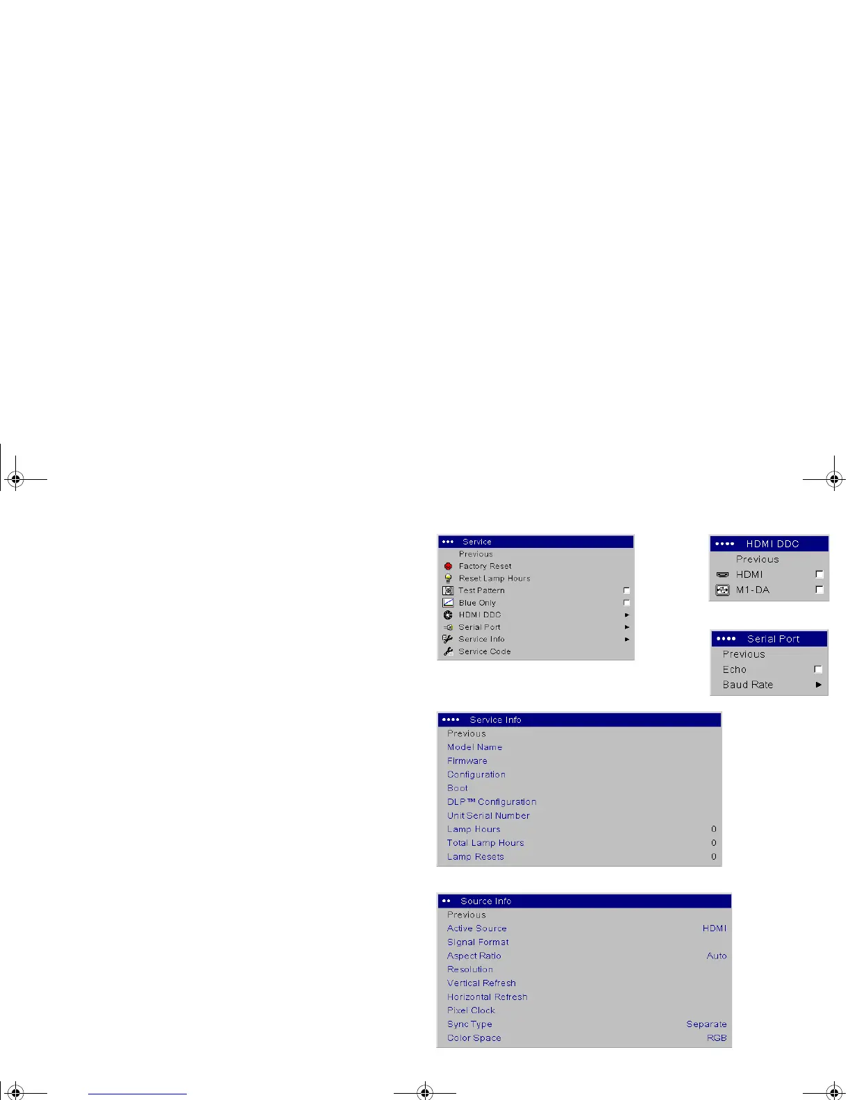 Reset Lamp hours: resets the lamp hours used counter in the Service Info