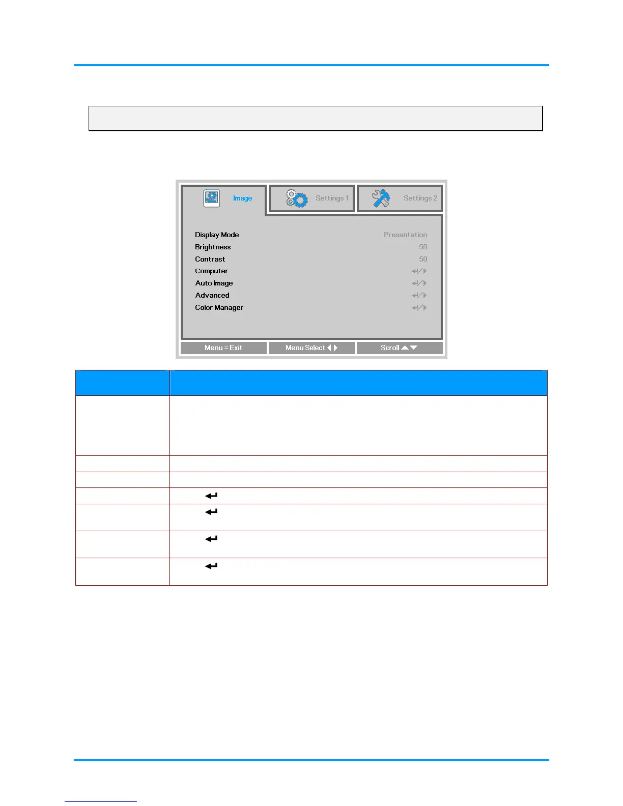 1. Display Mode must be set to User in order to access the other Image menu items.