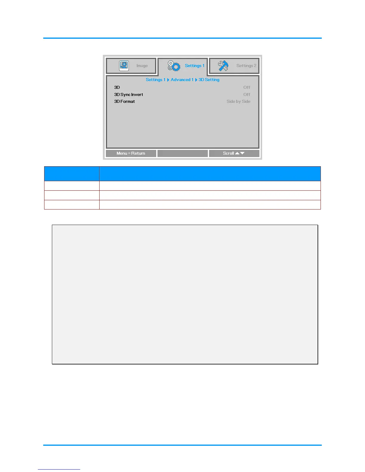2. When the projector is connected to an appropriate 3D source, the 3D OSD menu items are available