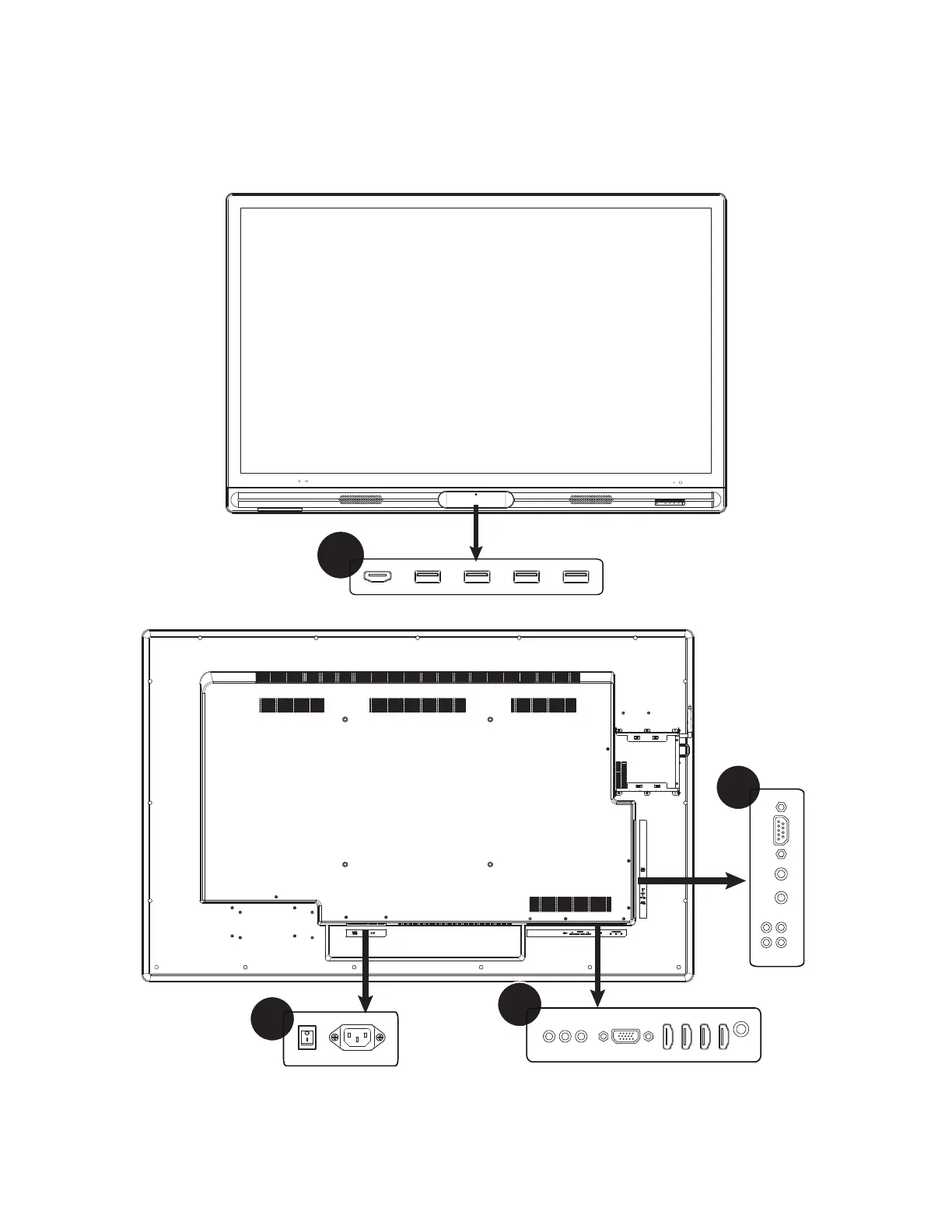 RCA (1), RS232 (1), Audio In 3.5mm (1), Audio In RCA (1-R/L), USB-A for touch control (1), USB 2.0-A (3), and Audio Out