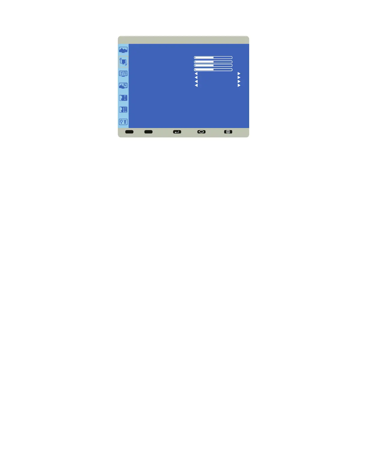 Screen Reset: resets all Screen menu items to factory default settings. Options: Yes and No.