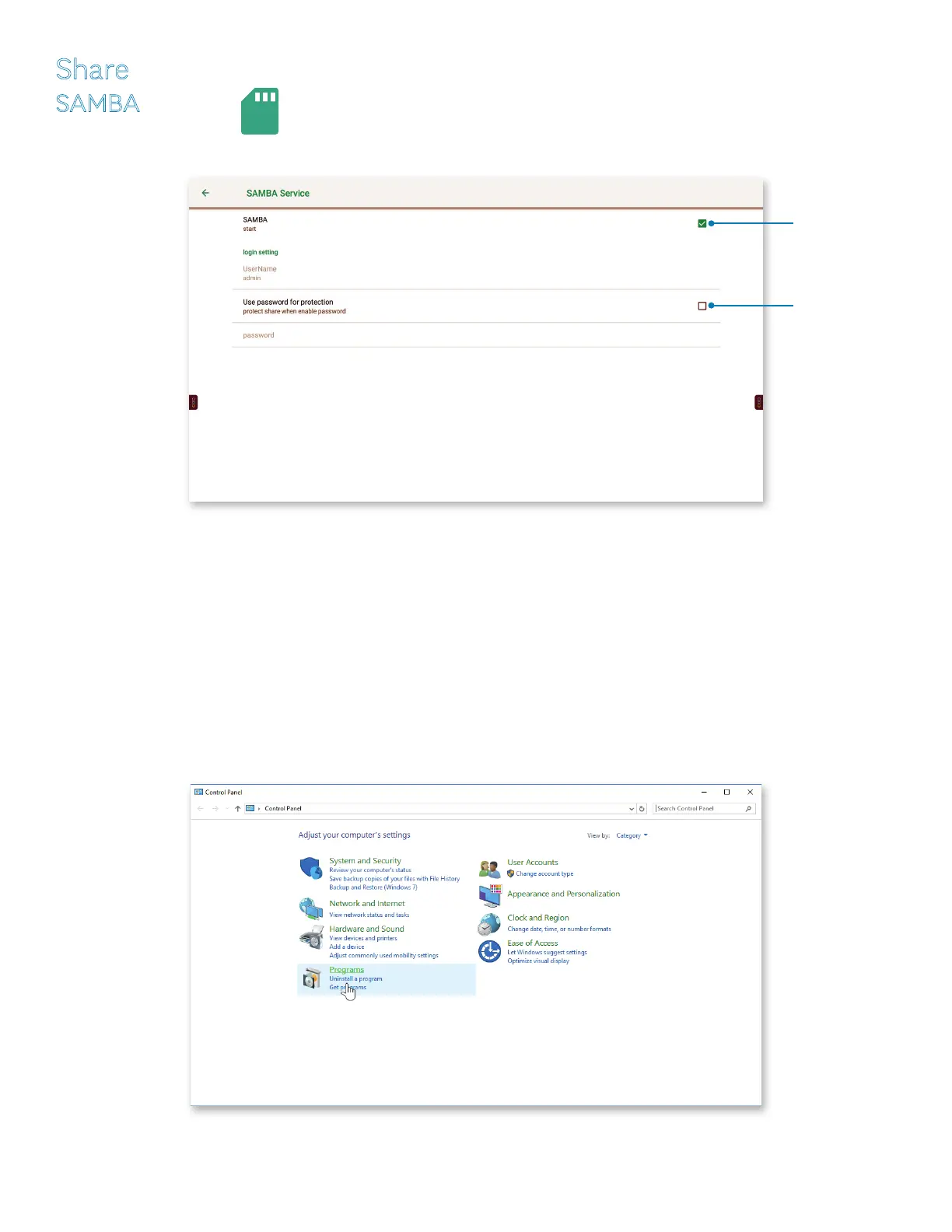 Tap SAMBA, the SAMBA icon or click the check box to the right to enable le sharing.