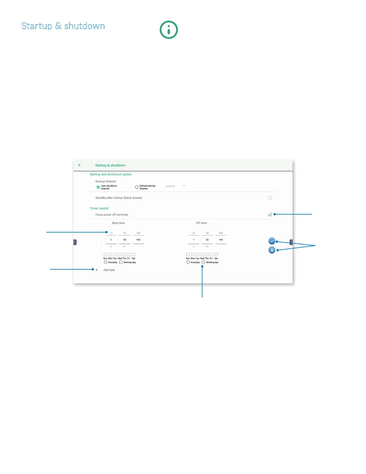 i) If you select Default startup channel, choose between Android, ChromeOS, HDMI1, HDMI2, or VGA.