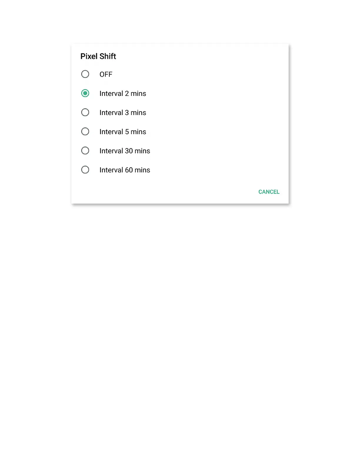 4) Tap Pixel Shift and choose an interval time between shifts. Or you can choose to turn Pixel Shift o.
