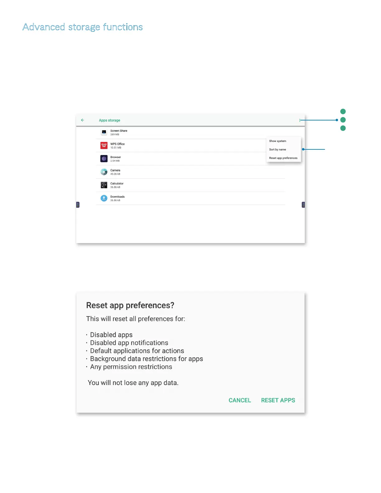 c) Tap Reset app preferences. The Reset app preferences? window appears. Tap RESET APPS to reset the preferences for all