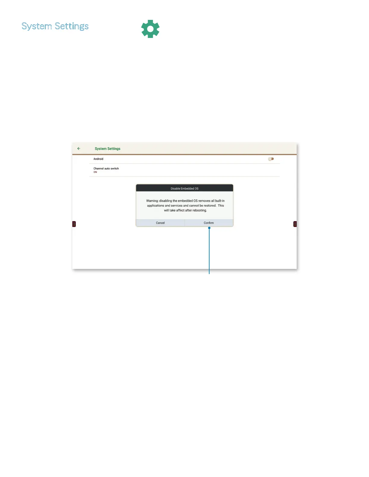 1) Tap Android, or the On/O button to the right (page 25), to show the Disable Embedded OS window. Tap Conrm to erase all