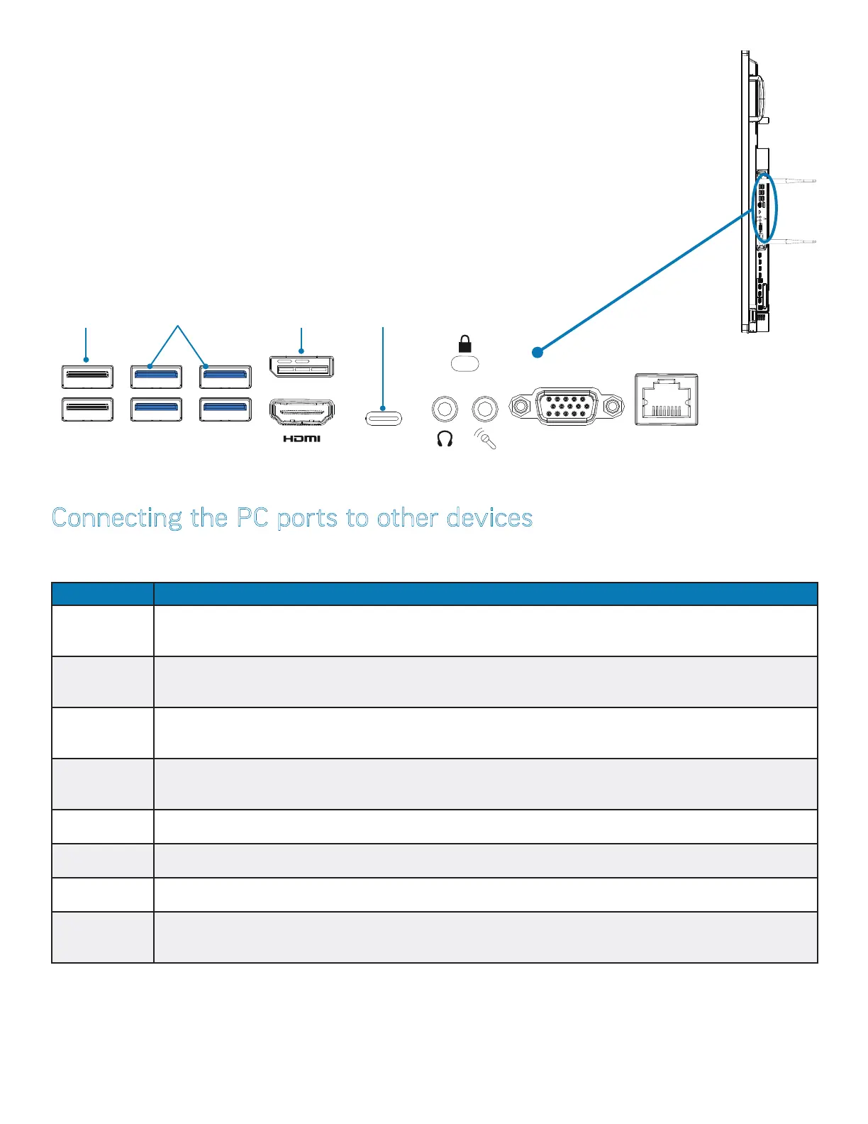 The PC and its ports are located on the right side panel (above). This table shows how to connect them.