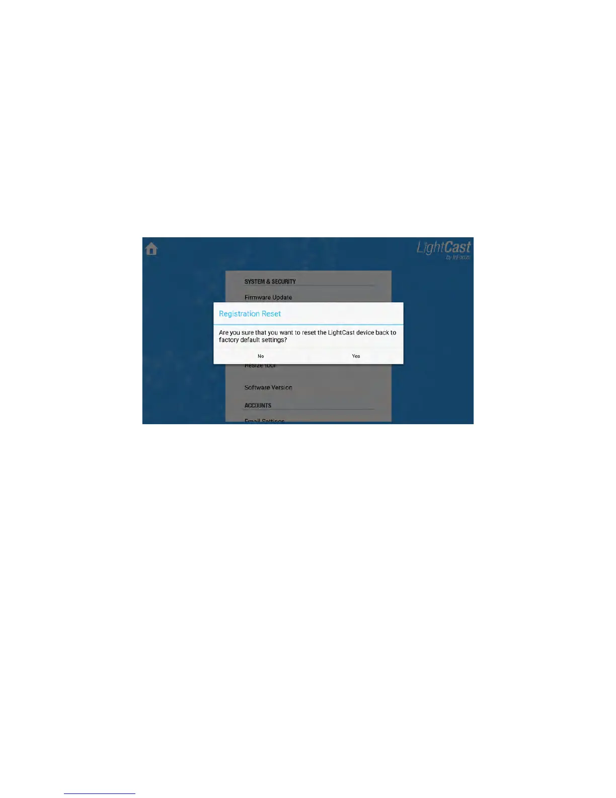 From the Settings menu, tap or click Reset to reset the LiteShow device registration. Tap or click Yes to initiate the registra-