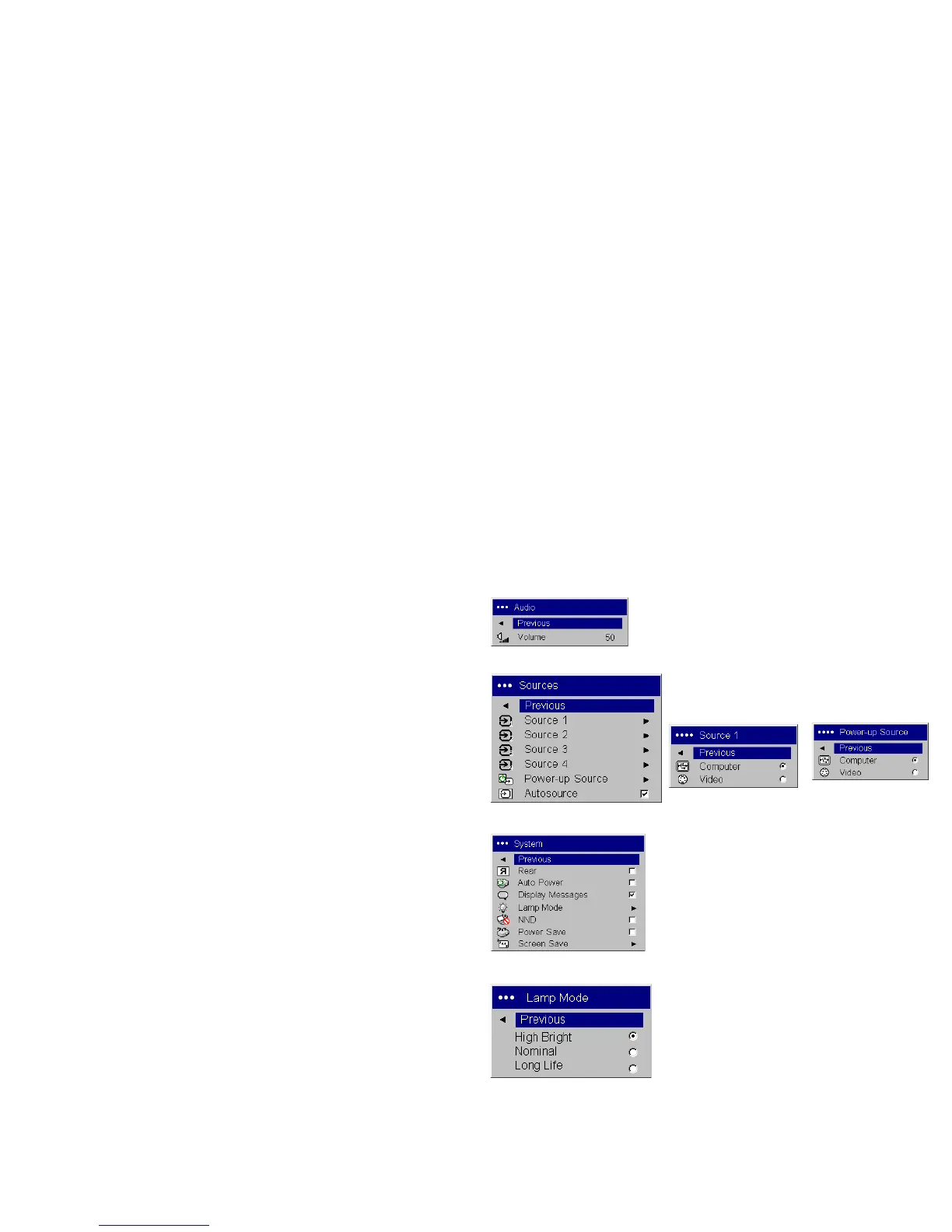 Power-up Source: determines which source (computer or video) the projec-
