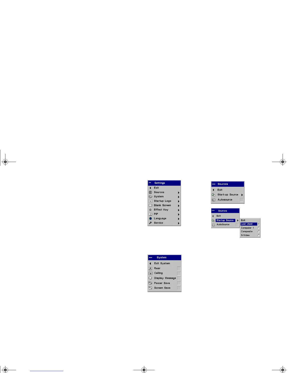 Ceiling: turns the image upside down for ceiling-mounted projection.