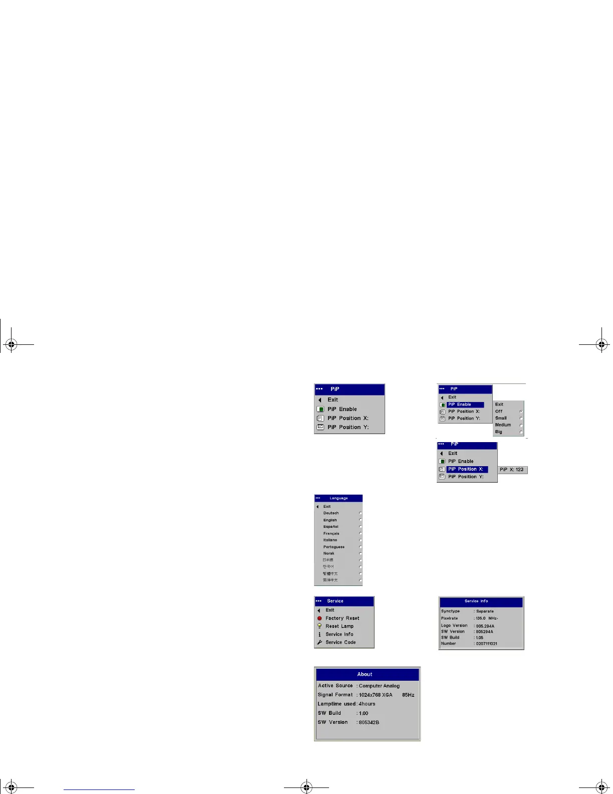 Reset Lamp: resets the lamp hours used counter in the About menu to zero.