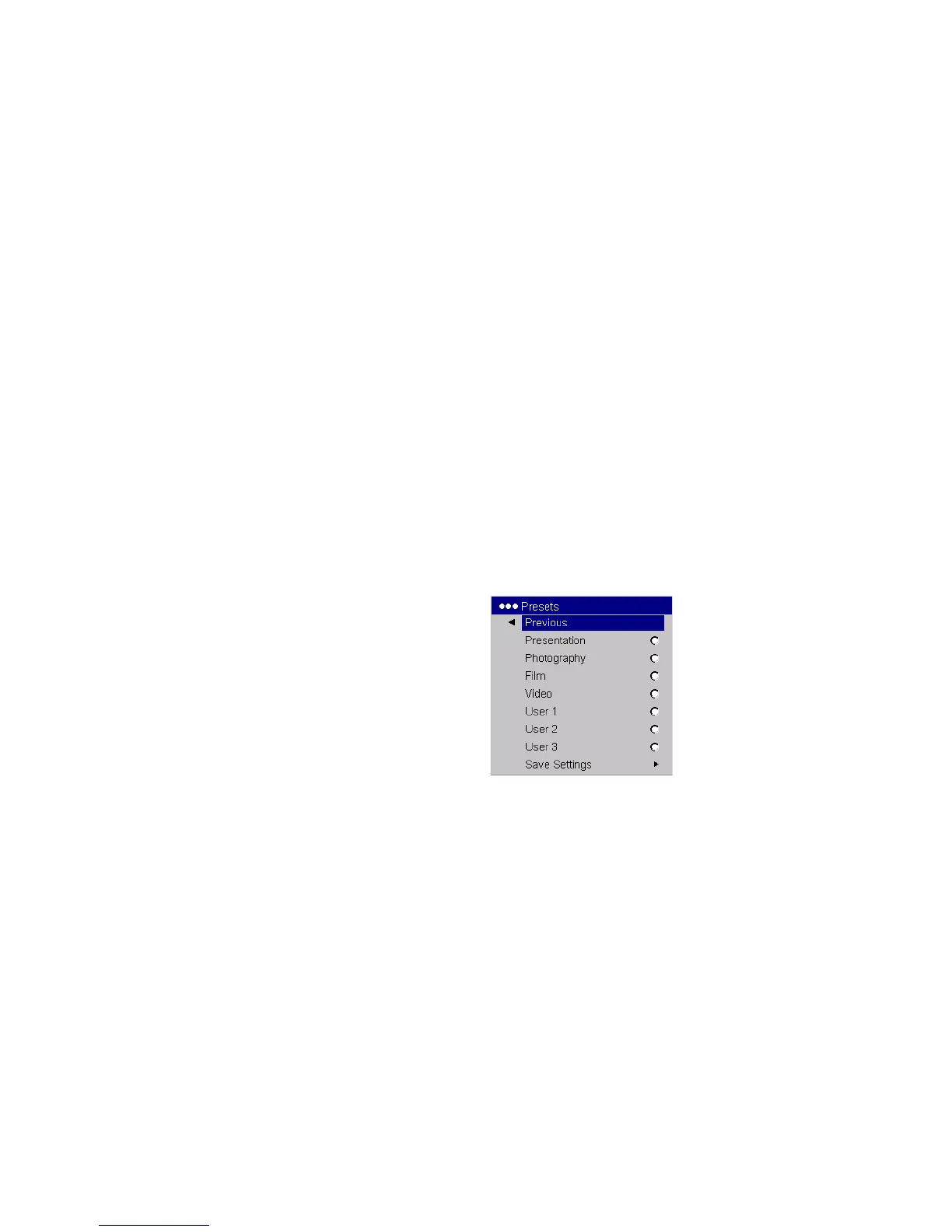 Presets: The provided Presets optimize the projector for displaying com-