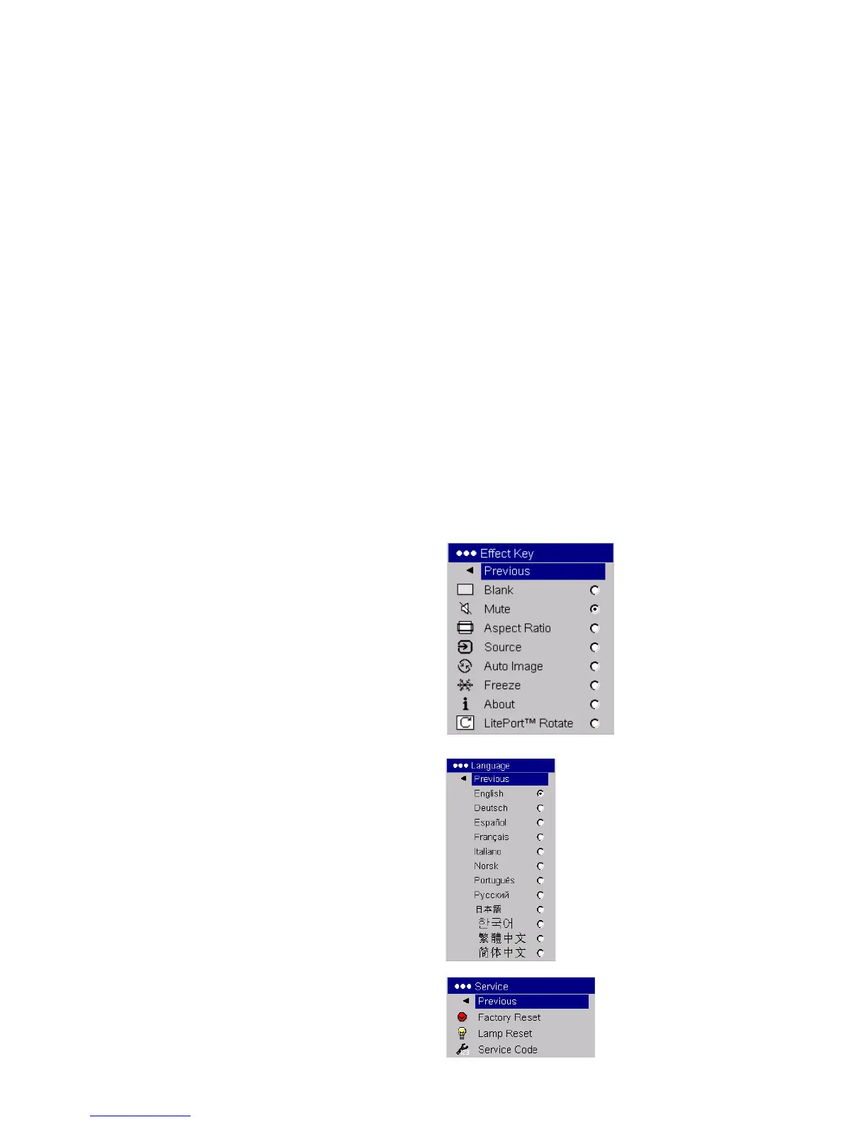 Lamp Reset: resets the lamp hours counter in the About menu to zero. Do