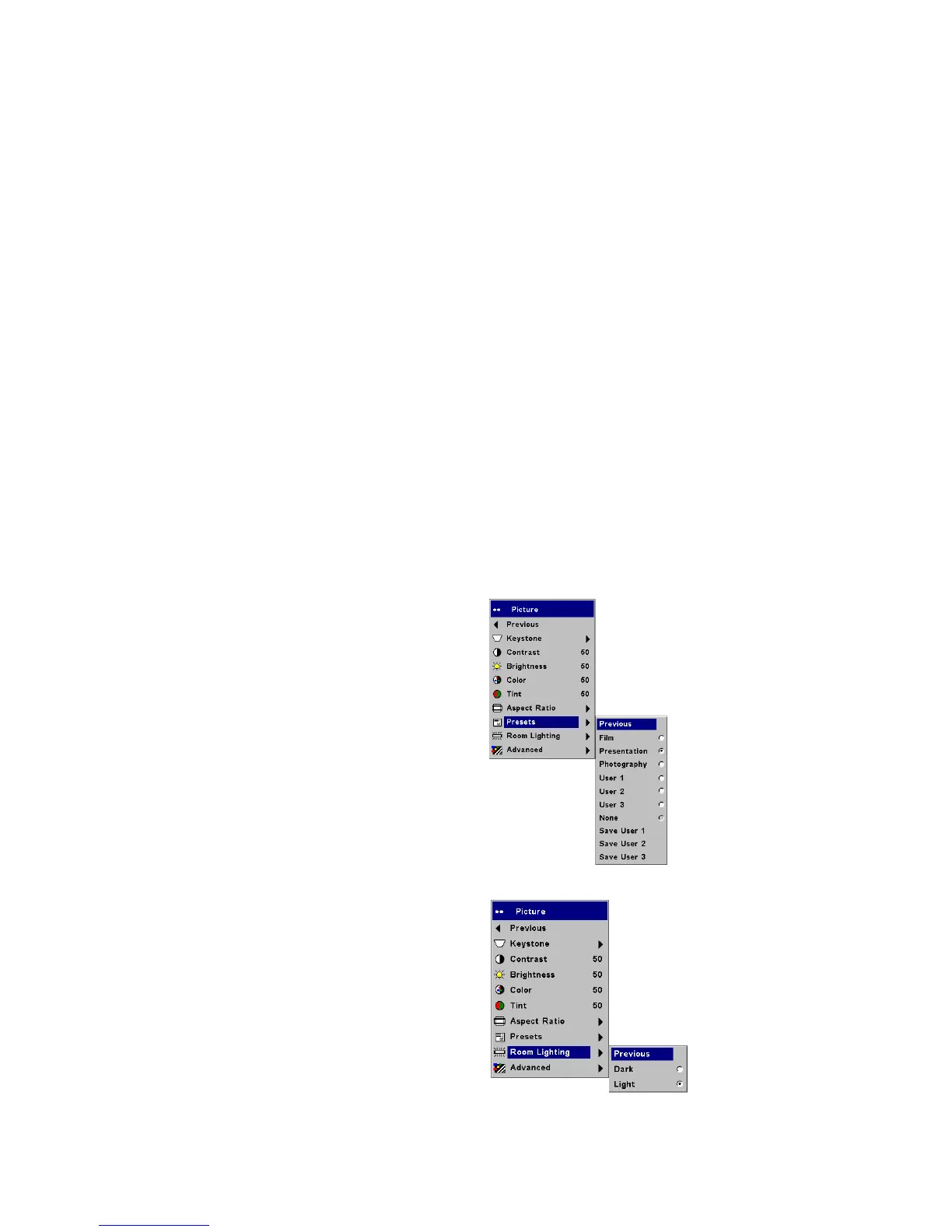 Presets: The provided Presets optimize the projector for displaying com-