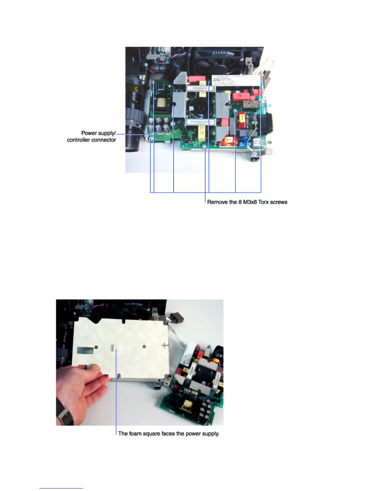 6 Remove the eight M3x8 Torx screws that fasten the power supply to the chassis.