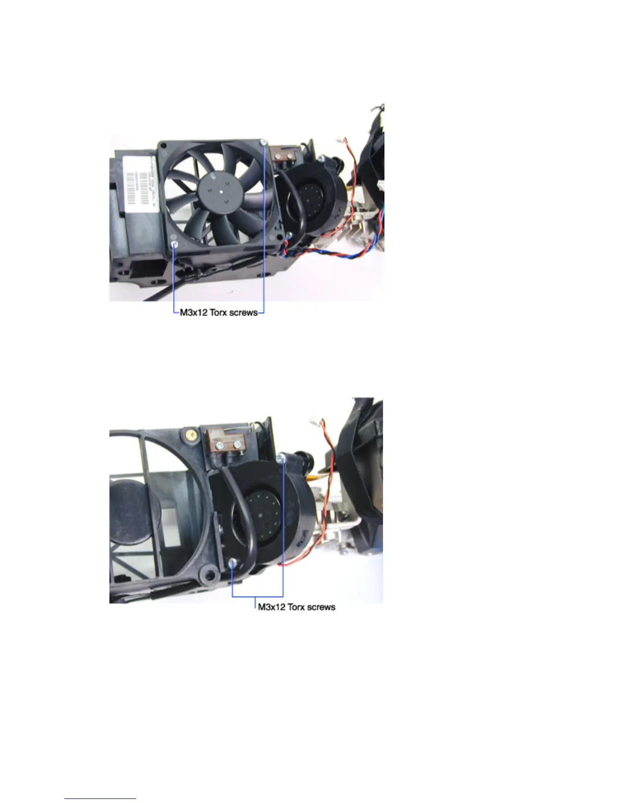 1 Remove the two M3x12 Torx screws that fasten the blower to the lamp housing.