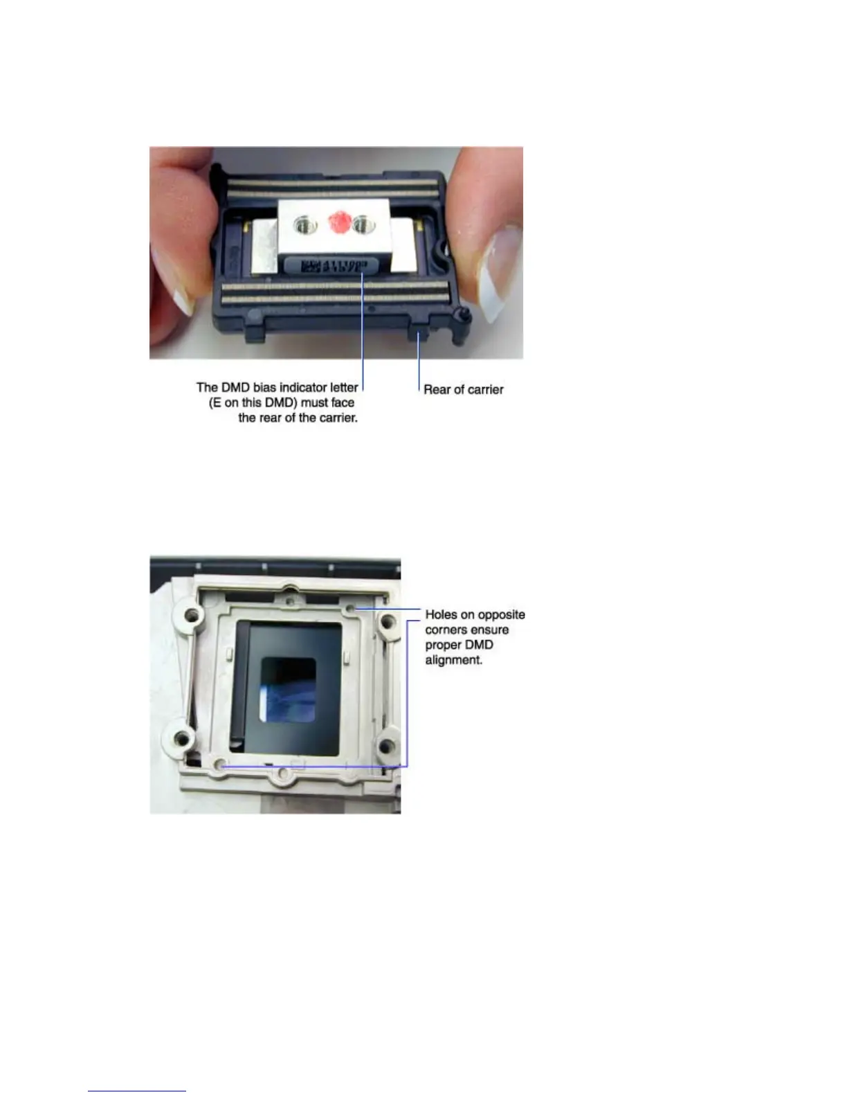 Make sure the DMD fits into the opening in the proper orientation. The DMD should fit loosely into