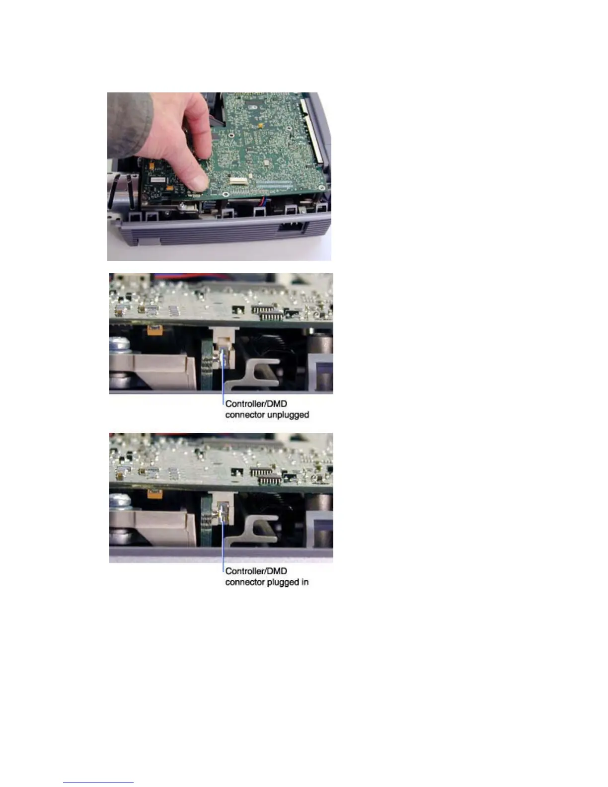 2 Align the controller/DMD connector, then press the controller down firmly. You will feel the
