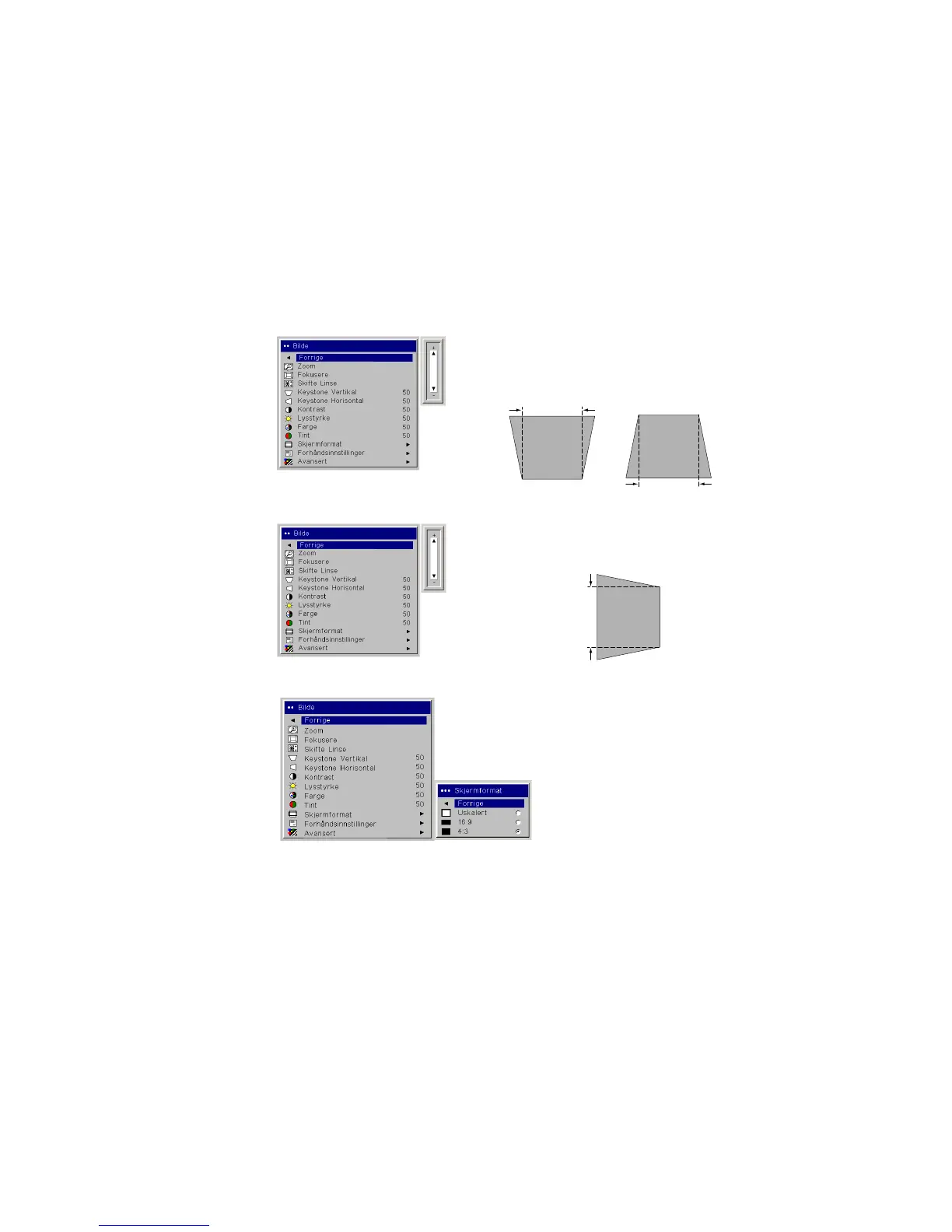 Keystone Horisontal: justerer bildet horisontalt og lager et mer rettvinklet