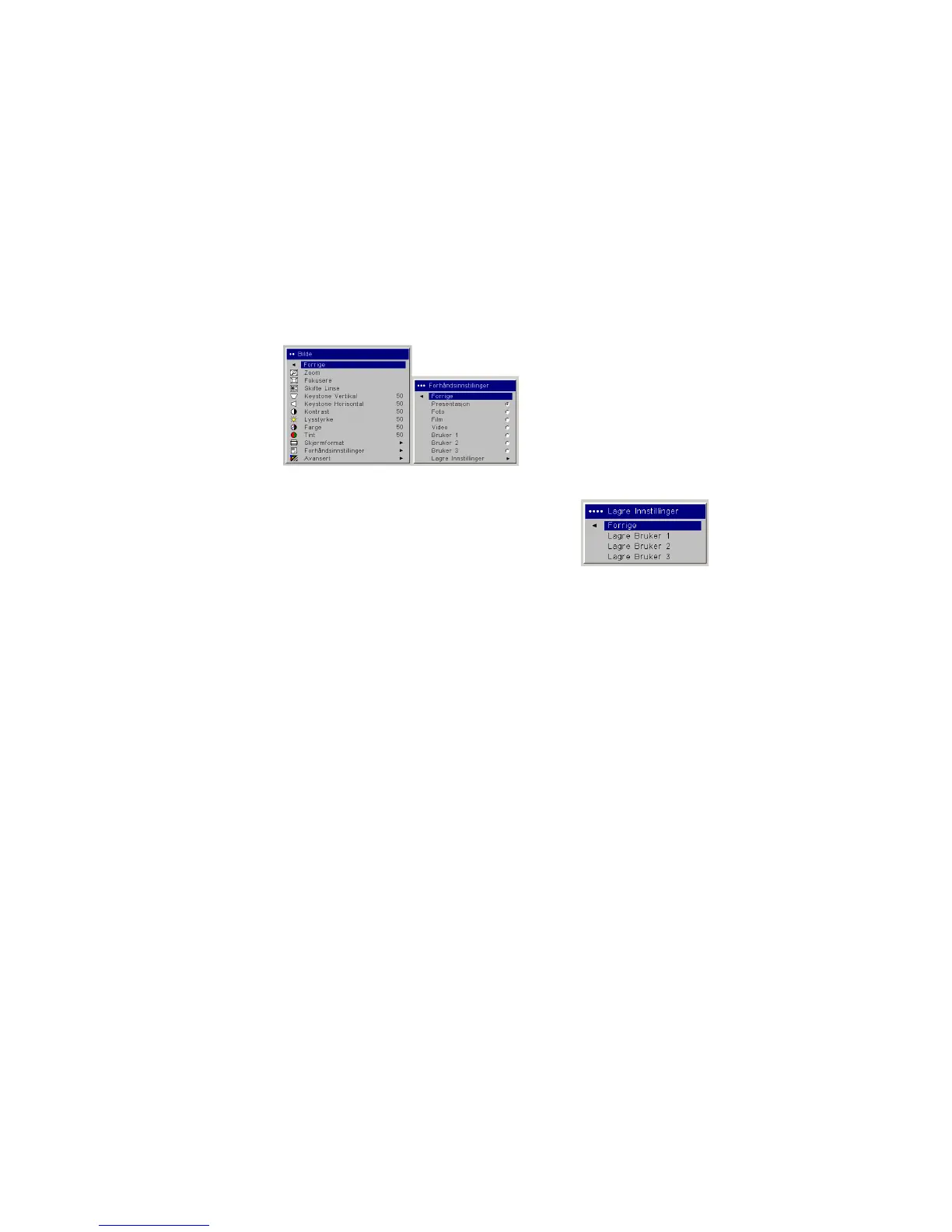 Lagre bruker 1, 2 eller 3 i menyen Lagre innstillinger. Du kan gjenopprette