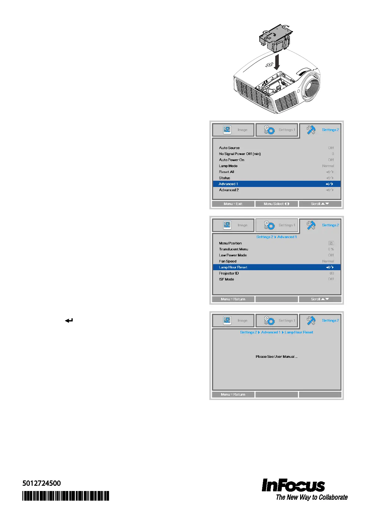7) To reset the lamp timer: Press the MENU button to open