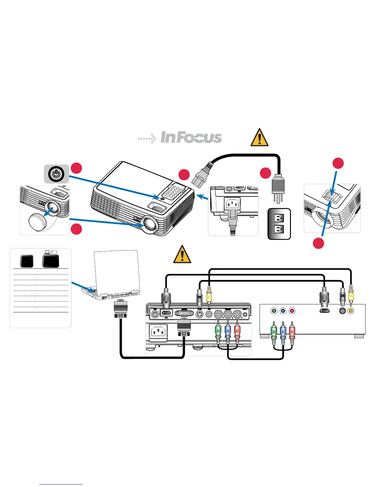 InFocus T90 - Projector Setup and Operation; Connecting Power and Peripherals; Adjusting Image Focus and Zoom; Toggling Display Output Settings