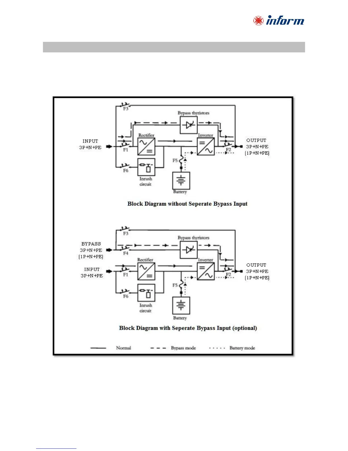 UPS block diagrams and the energy flow path in each operation mode is shown below: