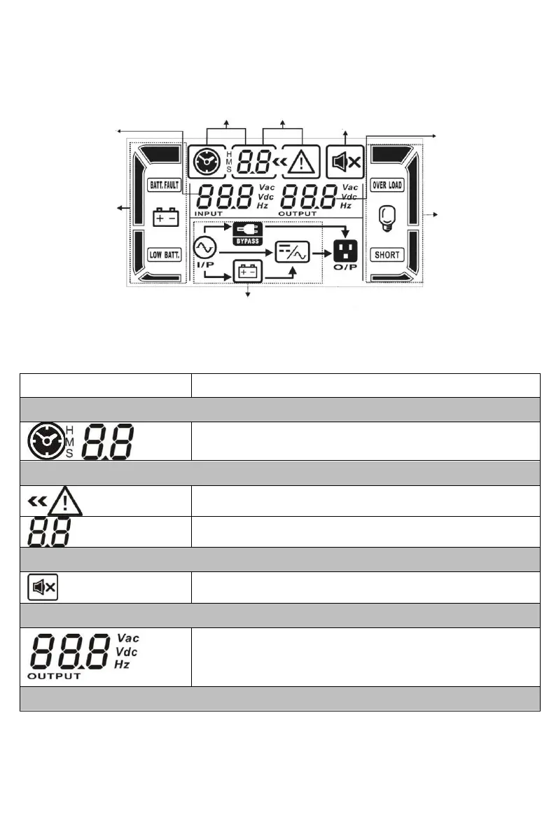 VAC : tension de sortie, VDC : tension des batteries, Hz :