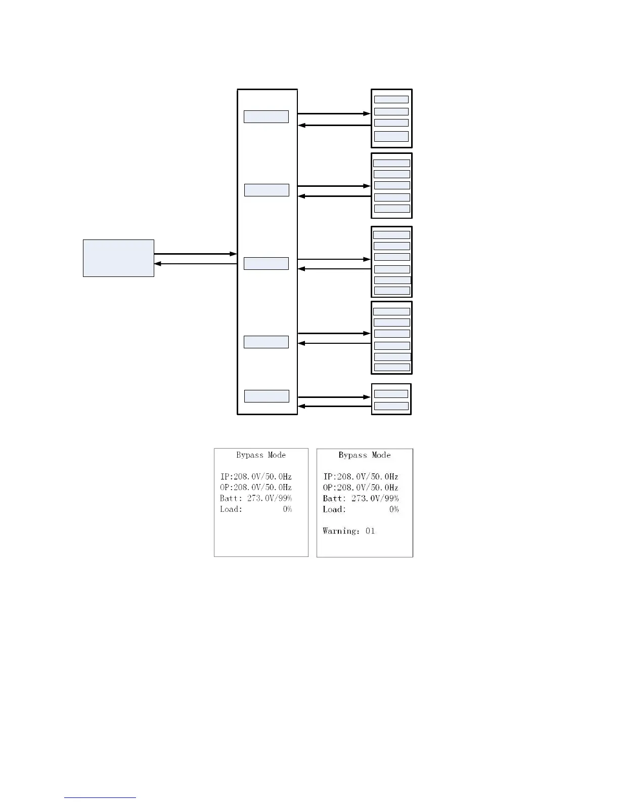 1) In the first line, it will display the UPS running status mode;