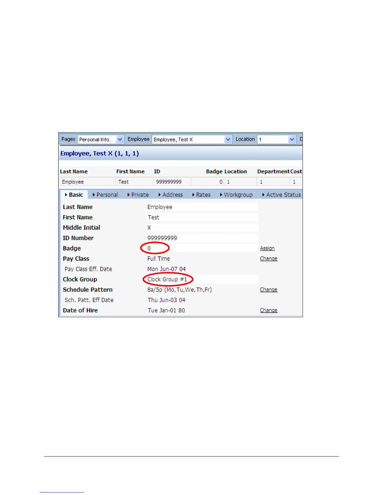 1. In the employee’s Personal Information, click the Basic tab. The Badge and Clock Group fields affect