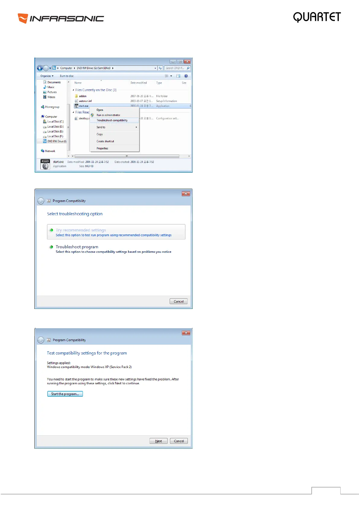 2. Right-click on"start.exe" then select "Troubleshoot compatibility" by left-mouse click.