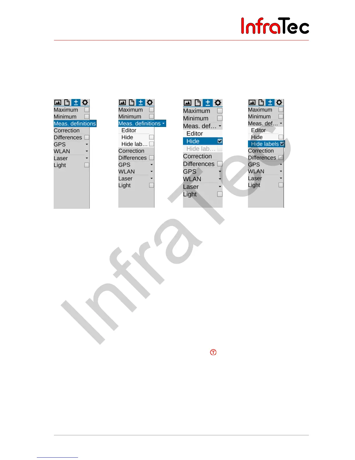 Already stored ROI can be hidden or shown by pressing the icon. Location and emissivity of the