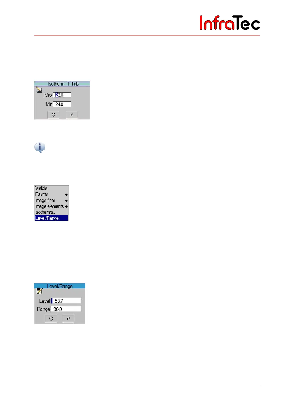 The menu item "Level/Range.." starts a dialogue for numerically defining values for the temperature