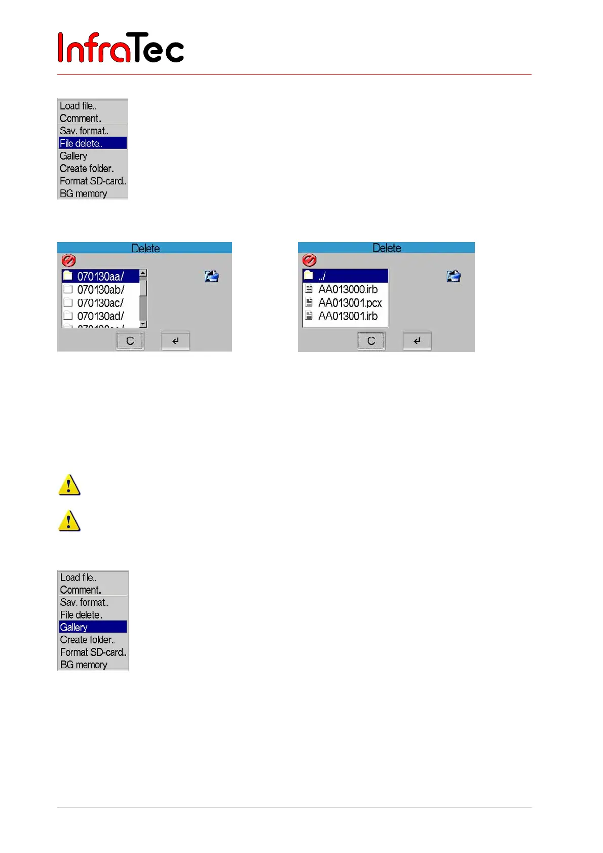 Via the menu item “Gallery”, the IRB files saved on the SD card are displayed as previews. By using the