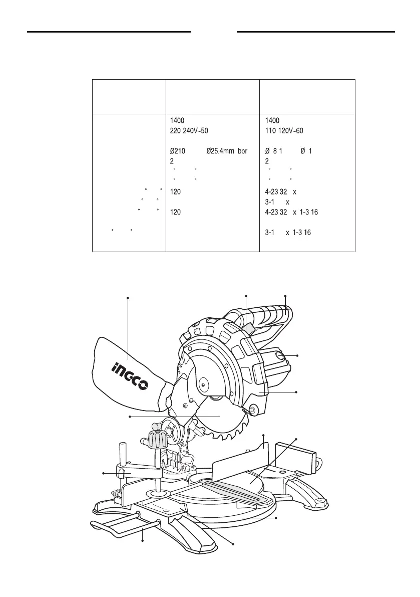 Ingco BMS14007 - Technical Specifications; Model and Power Details; Blade and Angle Capacities; Cutting Dimensions