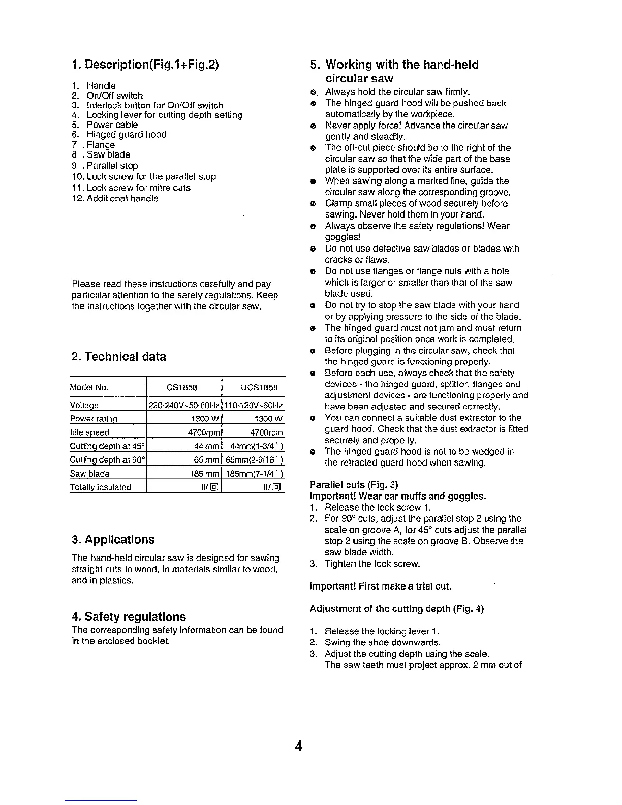 Ingco CS1858 - Technical Data; Applications; Safety Regulations; Working with the Hand-Held Circular Saw