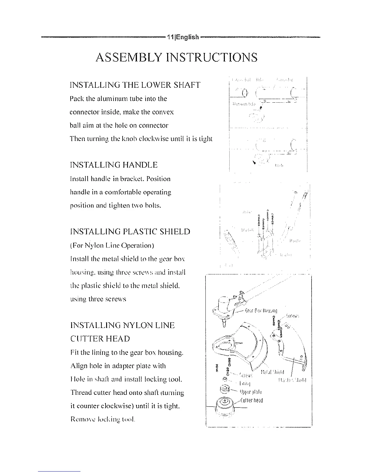 Ingco GBC45441 - ASSEMBLY INSTRUCTIONS; INSTALLING THE LOWER SHAFT; INSTALLING HANDLE; INSTALLING PLASTIC SHIELD