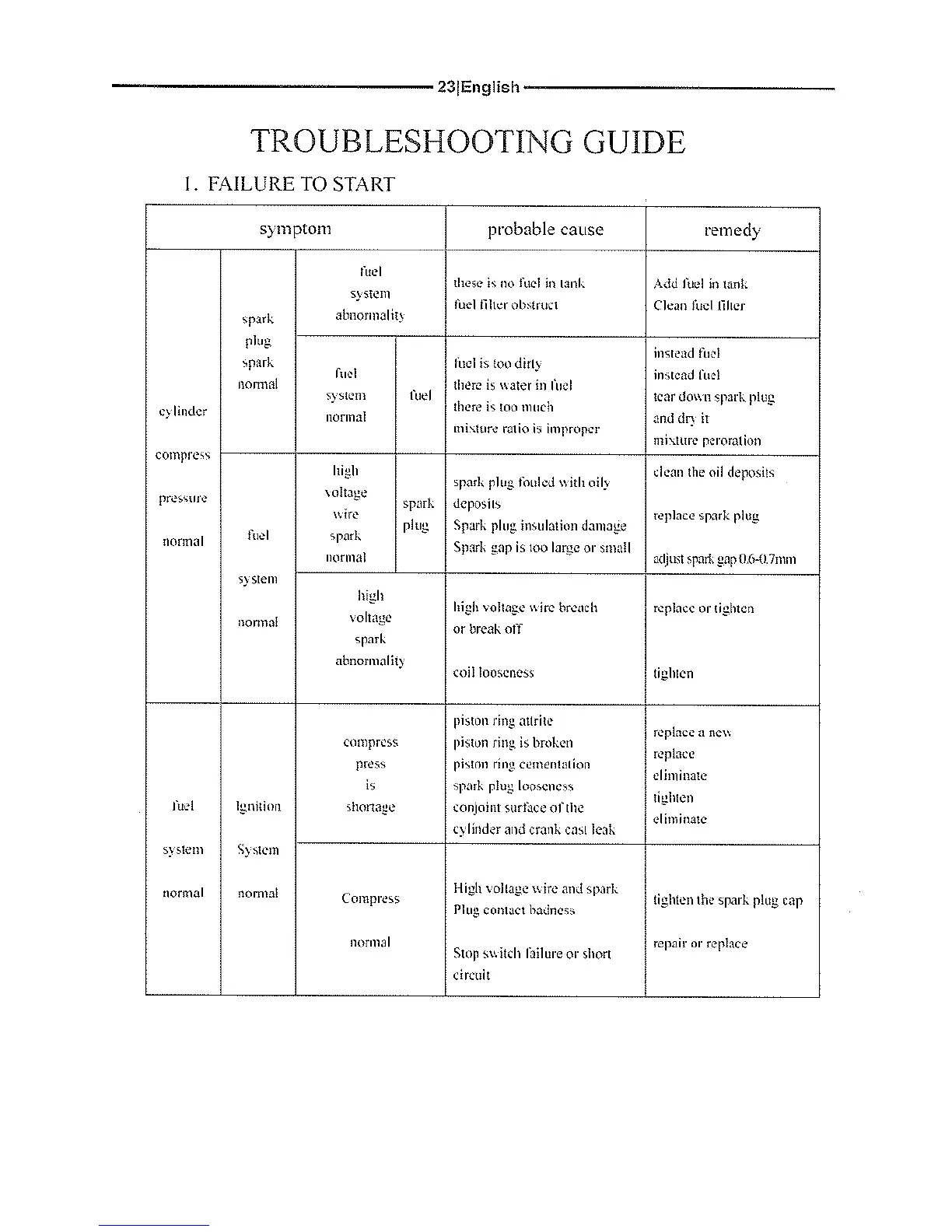 Ingco GBC45441 - TROUBLE SHOOTING GUIDE; FAILURE TO START