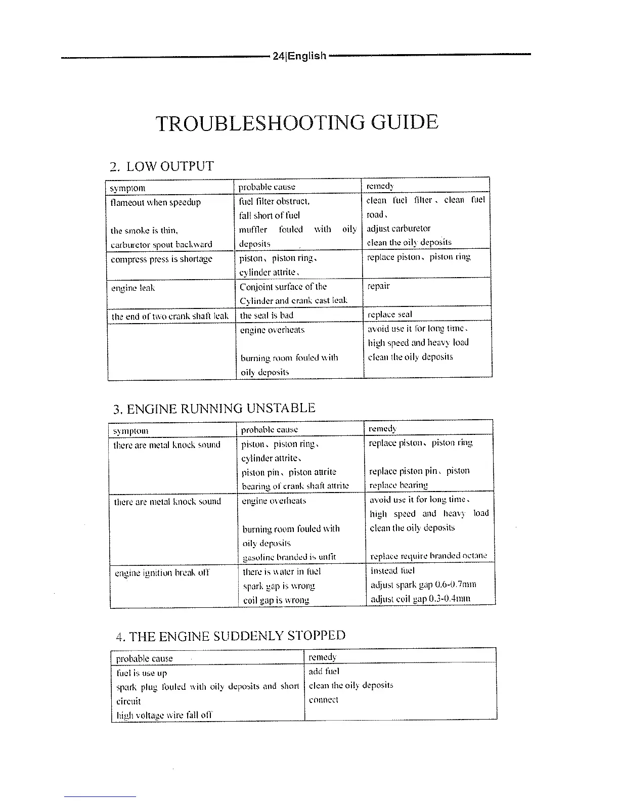 Ingco GBC45441 - LOW OUTPUT; ENGINE RUNNING UNSTABLE; THE ENGINE SUDDENLY STOPPED