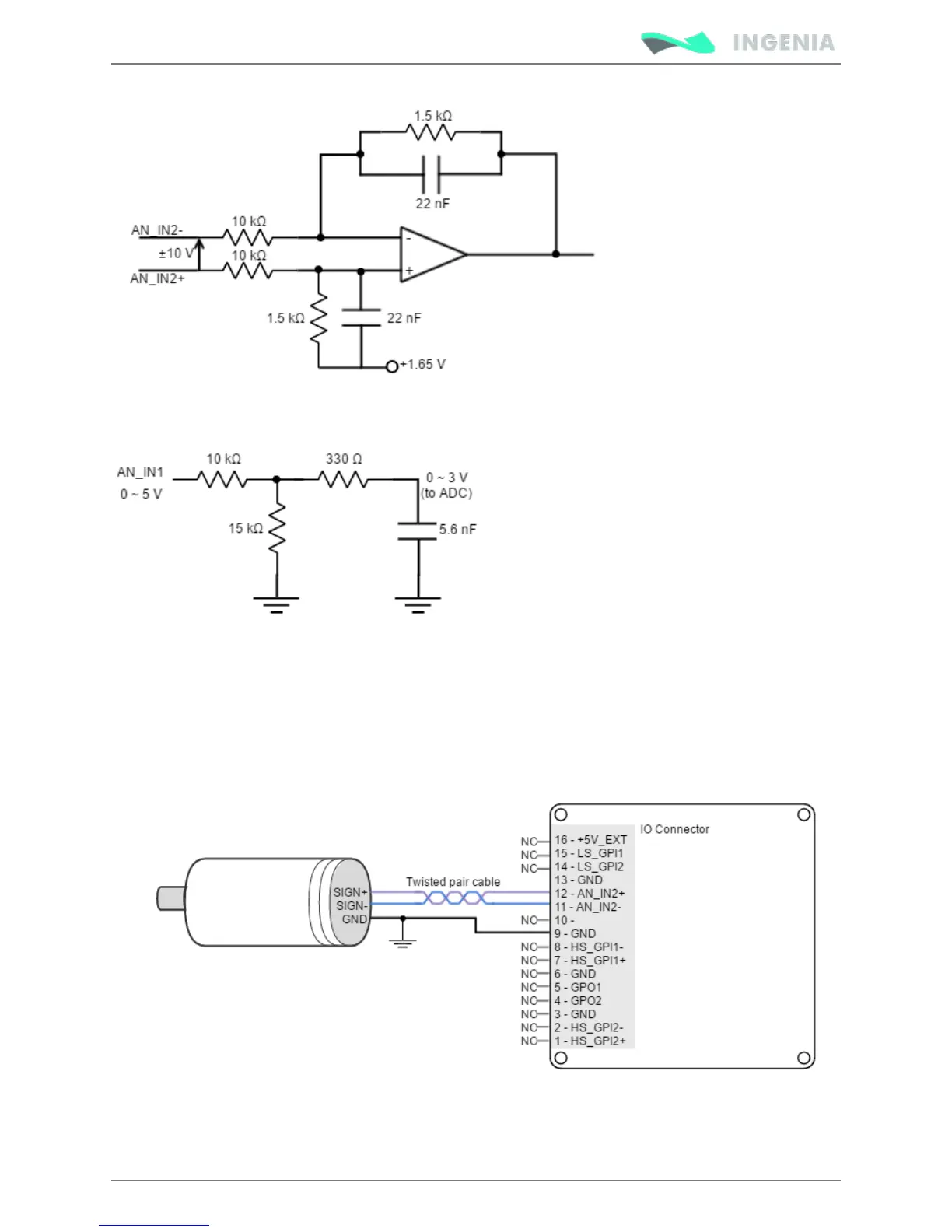 Next figures illustrate how to connect an analog source to the Pluto Servo Drive analog input 2 (for differential