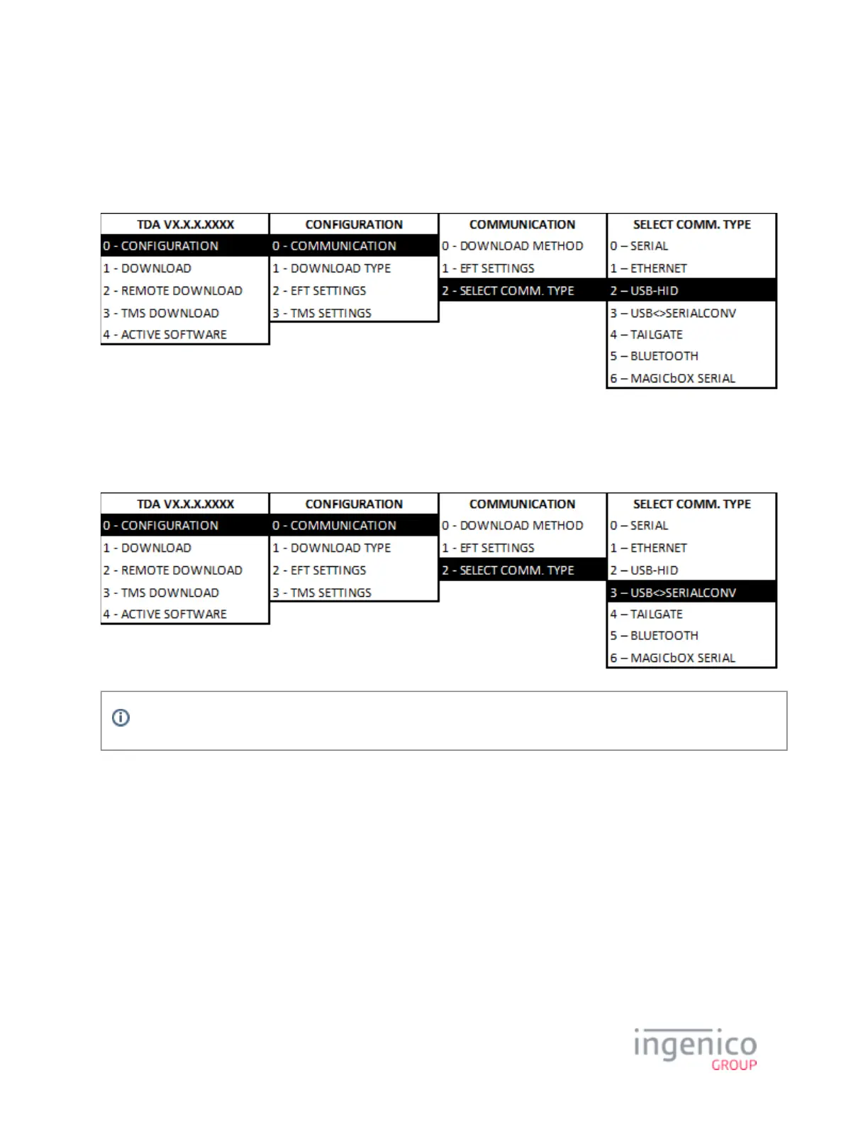 To view or select USB-CDC port settings, select the [CONFIGURATION] option from the Telium Download Application menu and