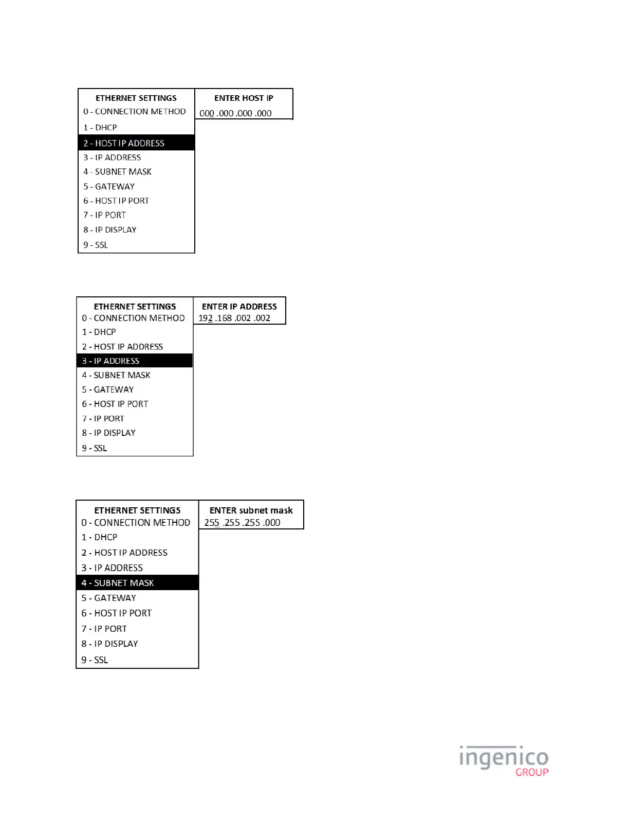 Enter values with keypad and press "Enter". To set or change the IP address, proceed as follows from the Ethernet Settings menu: