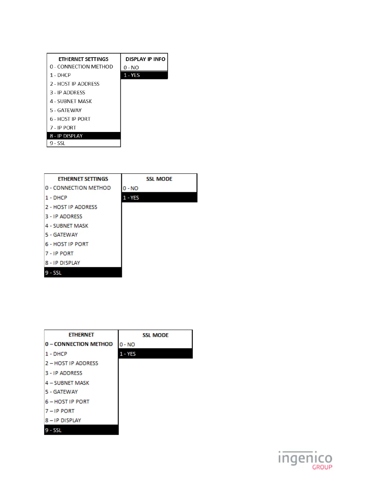 To select SSL mode, proceed as follows from the Ethernet Settings menu: